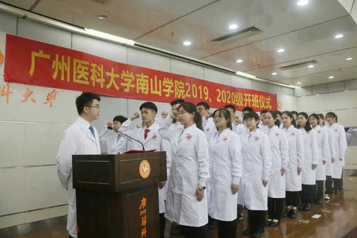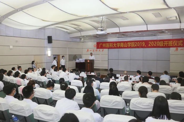今年的开班仪式有其特别之处:一是由于去年受疫情影响,因此2019、2020级的南山班开班仪式于今日同时进行;二是广州医科大学推广南山班办学模式和经验,兄弟院校遵义医科大学也在该校开办临床医学专业南山班,因此,该校2020级南山班学子也来到开班仪式的现场。广州医科大学副校长赵醒村,遵义医科大学党委书记何志旭、校长刘建国等学校领导以及两校有关职能部门、学院负责人和教师代表参加仪式。仪式由广医南山学院副院长高兴成主持。