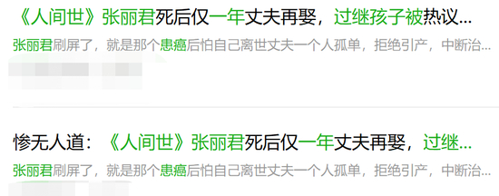 近日,有流言称,张丽君死后仅一年,丈夫就再娶了,孩子还被过继给其堂姐。众多网友指责男方负心、很自私,认为他不应再娶。