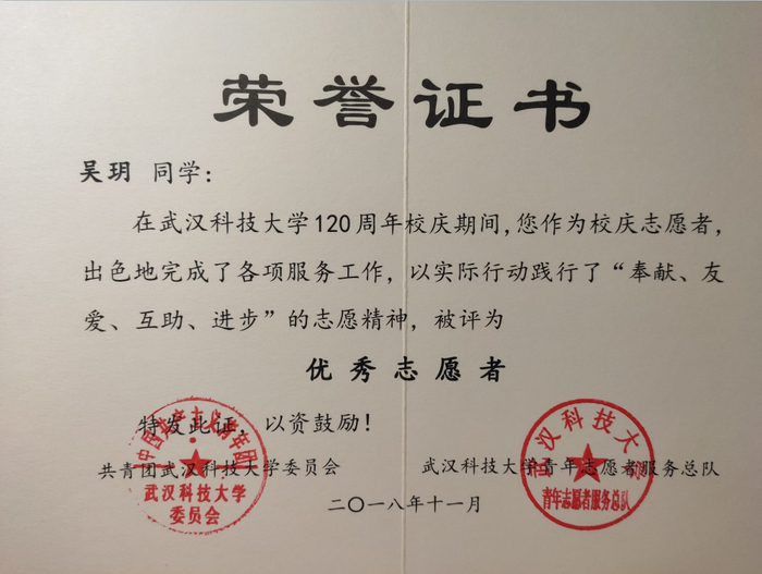 曾获我校120周年校庆“优秀志愿者”称号