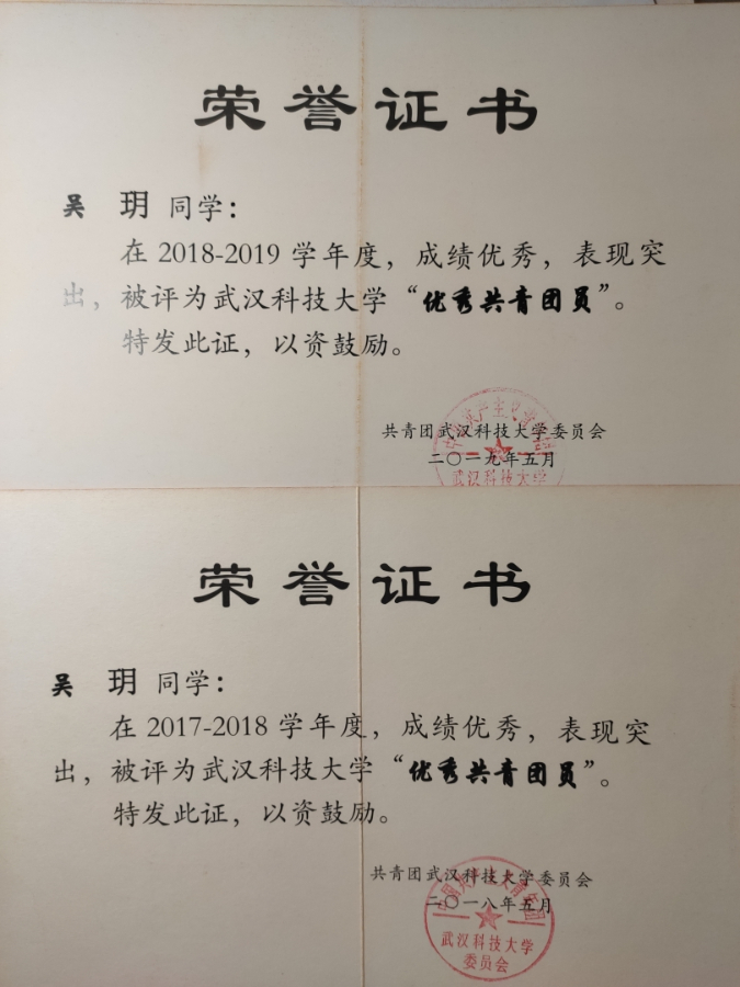 “优秀共青团员”证书