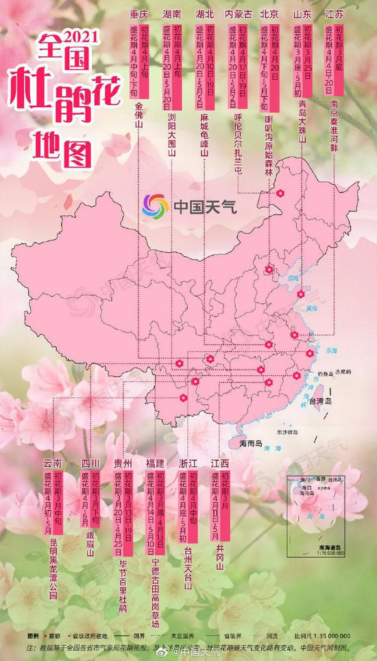 阳春时节,当樱花飘落、油菜花谢……轮到山花杜鹃登场了。每年的4月到5月品种繁多的杜鹃花在祖国大地从南到北竞相怒放,千姿百态、铺山盖岭。 这里有份全国杜鹃花地图,看看有无你的目的地?
