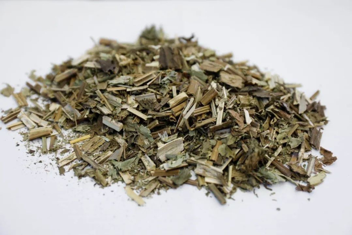 D. 泽兰饮片 本品呈不规则的段状。茎呈方柱形,四面均有浅纵沟,表面为黄绿色或带紫色, 节处紫色明显,有白色茸毛。切面为黄白色,中空。叶多破碎,展平后呈披针形或长圆形, 边缘有锯齿。有时可见轮伞花序。