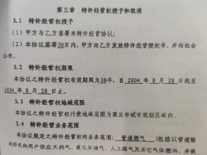 2007年,商丘新奥与商丘市市政公用事业管理局(现商丘市城市管理局)签订《城市管道燃气特许经营协议》。宋立志称,上述协议年限为30年,特许经营地域范围为商丘市城市规划区域内,且具有排他性。