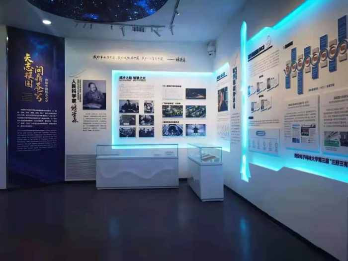 钱学森精神教育实践基地以“矢志报国、问鼎苍穹——致敬中国航天之父”为主题,由空间科学与技术学院历时半年精心设计建成,是学院“三全育人”的重要组成部分,基地由主体展览由“人民科学家钱学森”“科学精神传承者”“教育思想探索者”三个部分组成。该基地位于西电南校区教育部装备效能重点实验室,将成为西电传承钱学森精神、践行钱学森科学思想,开展党史航天史学习教育和思政教育的重要平台。