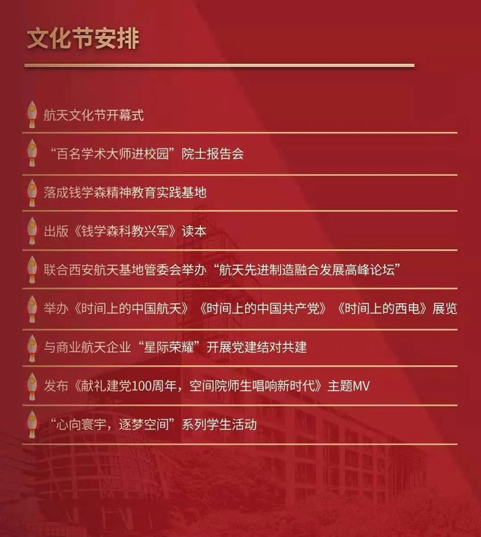 据悉,4月17日至5月10日,西安电子科技大学第五届航天文化节将以“航天报国路 永远跟党走”为主题,通过“百名学术大师进校园”院士报告、钱学森精神教育实践基地落成仪式、航天先进制造融合发展高峰论坛、“时间上的中国航天”展览、《钱学森科教兴军》读本出版、“心向寰宇,逐梦空间”系列学生活动等为全校师生带来一场内容丰富的航天文化盛宴和内涵深邃的红色航天思政课,引导全校师生赓续红色根脉,厚植家国情怀,弘扬航天精神,传播先进文化,用航天梦助力中国梦,为建党100周年、建校90周年献礼。