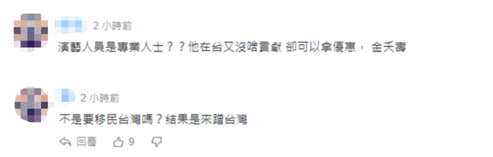 另外,还有些网友讽刺,“他在台又没啥贡献,却可以拿优惠。”“不是要移民台湾吗?结果是来蹭台湾。”↓