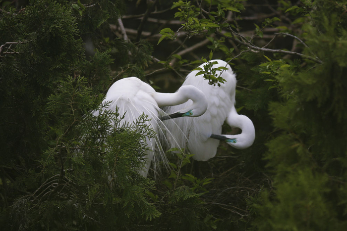 在江苏泗洪洪泽湖湿地国家级自然保护区,鹭鸟在枝头梳理羽毛。