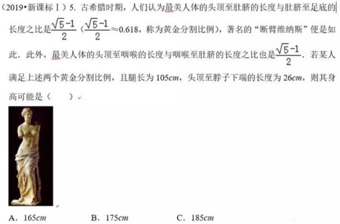 青岛大学某小编自称青大笑话校花,并在公开场合称自己头顶至咽喉的长度与咽喉至肚脐的长度比是(√5-1)/2,其腿长为105cm,头顶至脖子下端的长度为26cm,则其身高可能是 。