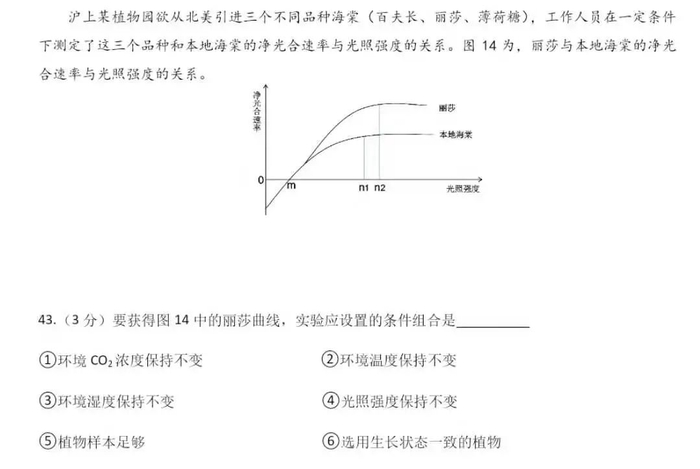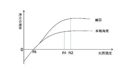 请听题:今年春天,青岛大学百卉园欲从北美引进三个不同品种海棠(百夫长、丽莎、薄荷糖),生命科学学院的同学对此十分好奇,在一定条件下测定了这三个品种和本校海棠的净光合速率与光照强度的关系,下图为丽莎与本地海棠的净光合速率与光照强度的关系。