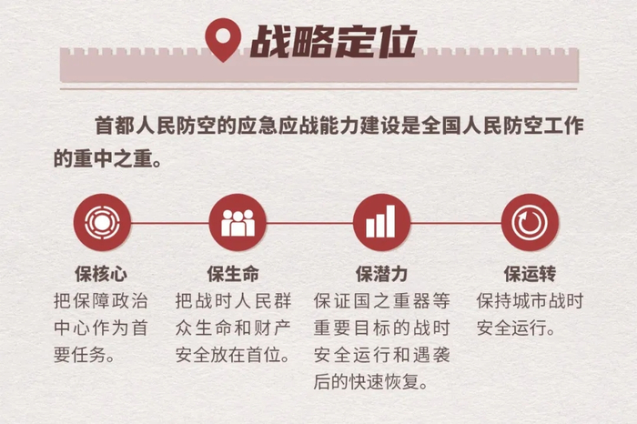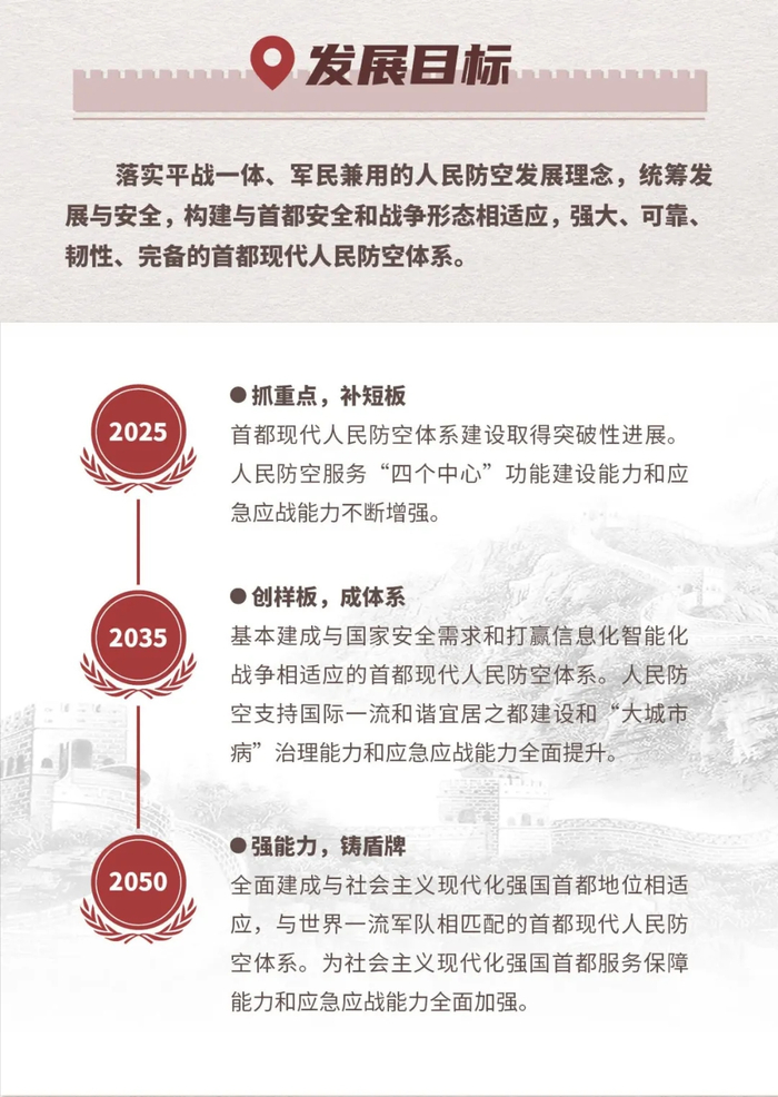 近日,北京市政府正式批复了《北京人民防空建设规划(2018年-2035年)》(以下简称《人防规划》),标志着首都人民防空工作建设发展迈出重大步伐。规划构建了一个与现代战争形态相适应、与北京“四个中心”战略定位相匹配的强大巩固的首都现代人民防空体系,是新时代首都人民防空发展的新蓝图。