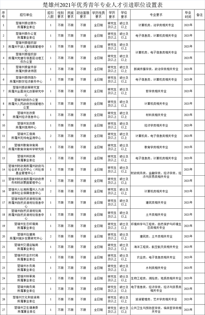 2021年云南省楚雄州优秀青年专业人才专项招引