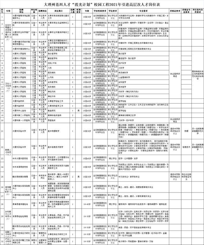 此次计划引进44名高层次人才。取得博士研究生学位人员,年龄可放宽到45周岁(其中卫生人才专项不受年龄限制)。如此次招聘专业范围外的博士研究生有意向到大理就业创业的,可先行与州委组织部或州人力资源和社会保障局联系。具体引进岗位及人数、条件见下图:
