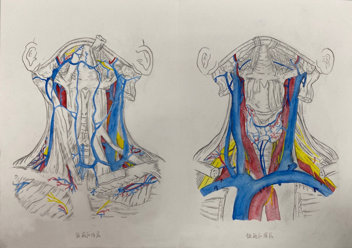 作品简介:参照颈部实物及已有的颈部前区结构示意图,描绘出颈部前区浅、深两层的结构。运用素描形式勾勒肌肉以及结构纹理结合水彩形式描绘动静脉及神经走形使颈部前区结构清晰明了。