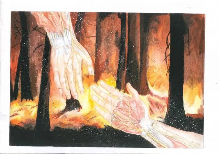 作品简介:在灾难降临的那一刻,爱,迸发出了最动人的力量――亲人之间,生死相依;朋友之间,相互激励;陌生人也挽起手臂。本幅画作描绘了一场森林火灾中的救援,两双手均画出了肌肉神经,代表着施救者和被救者均是血肉之躯,但他们在灾难面前不离不弃,体现了人类心存大爱的高尚品质。火焰象征着灾难,它可能是地震、洪水、火灾也可能是疫情。施救者可能是被救者的亲人、朋友,乃至救援队、人民警察亦或是普通的陌生人,但不变的是那份人与人之间值得百世歌颂的爱与关怀。