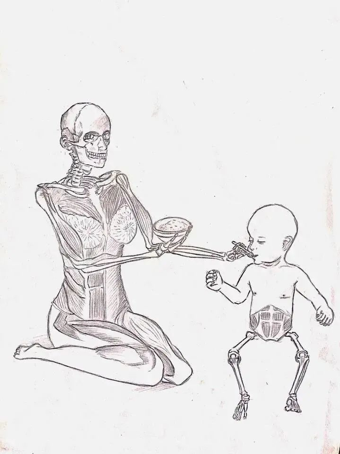 作品简介:母亲不仅赋予我们生命,还给予我们茁壮成长的机会,其中母亲所花费在孩子的时间精力是无法用价值衡量的。此幅画中,母亲从脚到头为“皮肤-肌肉-骨骼”的逐渐剥离,而孩子则是从脚到头为“骨骼-肌肉-皮肤”的逐渐补充。这种方式将母亲培养孩子所花的精力具像化为骨肉皮肤,夸张而言,这不正是以生命喂养生命吗?此图的灵感来自于对我无微不至关怀的母亲,我诚挚地用它来敬献我的母亲,也敬献所有的母亲!