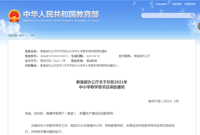 【教育】定了!教育部公布2021年中小学教学用书目录