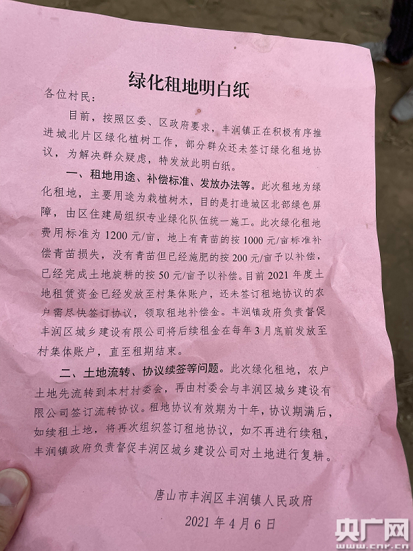 但近日,央广新闻热线收到群众反映称,河北唐山市丰润区政府强制要求多个村庄的村民将耕地统一流转给一家公司,由其在耕地上种树。当地宣称,此举是为了大气污染防治,对城北片区绿化植树。麦苗为何被迫给树苗“让道”?改善生态和保护耕地因何在这里“打架”?