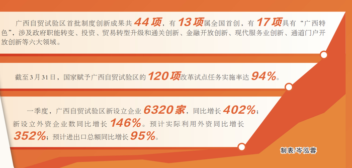 随着制度创新红利持续释放,广西自贸试验区高质量发展步伐愈加稳健。截至3月31日,今年自贸试验区新设立企业6320家,同比增长402%;新设立外资企业数同比增长146%。预计实际利用外资同比增长352%;预计进出口总额同比增长95%。(周红梅)
