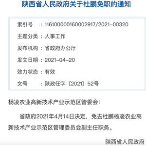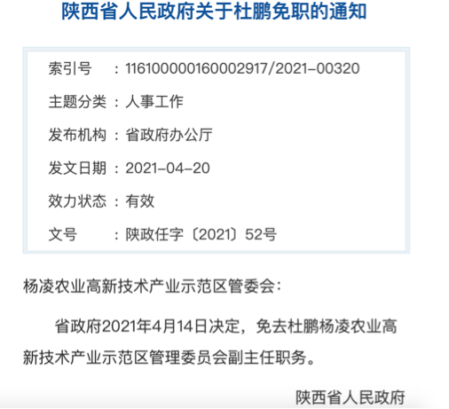 4月20日,陕西省政府官网发布《陕西省人民政府关于杜鹏免职的通知》:省政府2021年4月14日决定,免去杜鹏杨凌农业高新技术产业示范区管理委员会副主任职务。