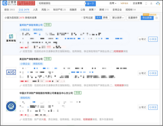 短期健康险是指保险期间在一年及一年以下且不含有保证续保条款的健康保险,目前市面上火热的“百万医疗险”是常见形式。健康时报记者在企查查搜索“短期健康险”,经营范围中包含健康险、短期健康险的企业达3055家,而保险行业涉及2478家。