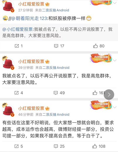 有趣的是,“天津股侠”似乎也关注到自己被证监会通报点名的情况。今天下午,“天津股侠”连续发布两条微博表示 :“被点名了!侠哥的自媒体微博是个人炒股日志,没有任何商业活动,也不会干违法事情,请大家监督。”,随后又补充:“少说两句了!不知哪句话说错了。”