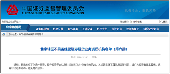 北京证监局提醒:近期,发现上述场外配资或投资平台、财经自媒体存在极高风险,其运营主体不属我局监管对象,请广大投资者提高警惕,远离非法证券期货活动,避免财产损失。
