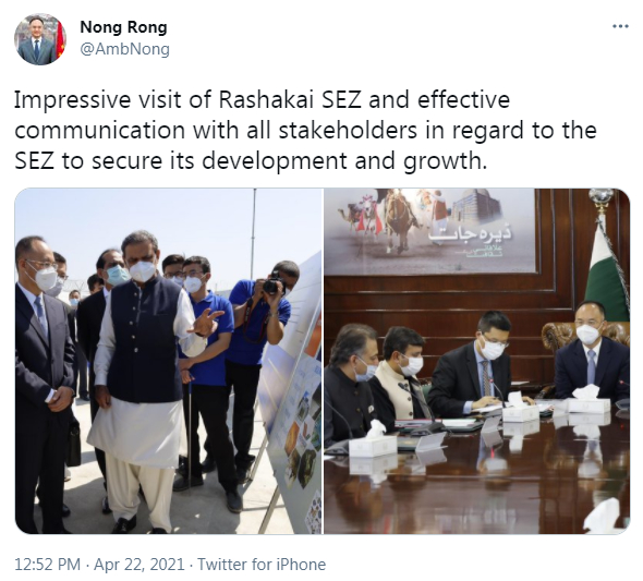 爆炸发生后,中国驻巴基斯坦大使农融发了一条推文,没有提到袭击事件,他写道:“对拉沙卡伊特殊经济区(SEZ)的访问令人印象深刻,与各方就特殊经济区进行了有效沟通,以确保其取得发展和增长。”