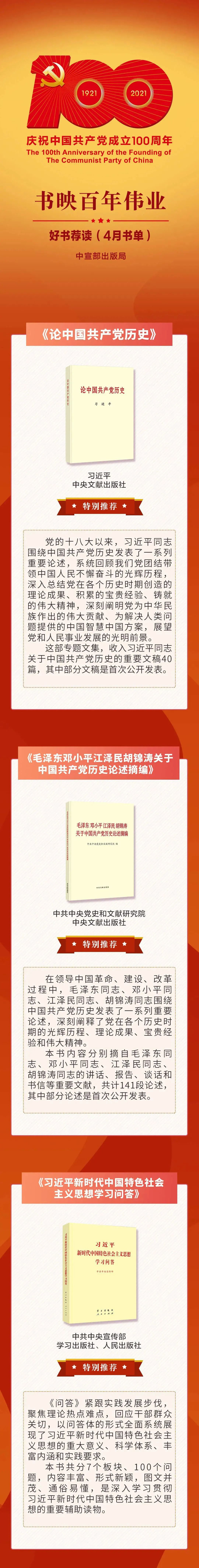来源:北京中医药大学为庆祝中国共产党成立100周年,中共中央宣传部出版局联合有关单位和部门开展“书映百年伟业——庆祝中国共产党成立100周年好书荐读”活动,于2021年4月—12月,每月向全社会公布当月推荐书单。4月书单,一起来看↓↓↓