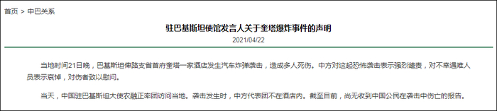 4月22日,农融大使发布了一条新推文,但其中并未提及爆炸案,称“访问拉沙卡伊特殊经济区(SEZ)给他留下了深刻的印象,他与各方就特殊经济区进行了有效沟通,以确保其取得发展和增长”。同一天,中国驻巴基斯坦大使馆官网也发布消息称,袭击发生时,中方代表团不在酒店内。截至目前,尚无收到中国公民在袭击中伤亡的报告。