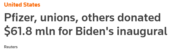 (图为路透社昨天的一篇报道显示“国际电气工人兄弟会”为今年拜登的就职典礼捐出了100万美金)