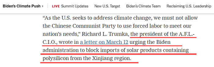实际上,该报在报道中就已经说漏了这一情况,称目前正呼吁拜登当局以“强迫劳动”和“侵犯人权”为由封杀中国新疆以及中国整个太阳能板产品的,包括美国大型产业工会“美国劳工联合会-产业工会联合会”(AFL-CIO)。