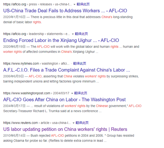 值得一提的是,这其实早已不是美国这些国会第一次打着“人权”的旗号抹黑中国的产业和产品了。如下图所示,“美国劳工联合会-产业工会联合会”这个特别支持美国政府对中国产品征收关税、打击中国产业的组织,在过去10多年里就一直对中国工人的“人权”表现得格外关心。只不过该组织的这种自相矛盾已经充分说明了它们对“人权”的关心到底是出于什么目的了。