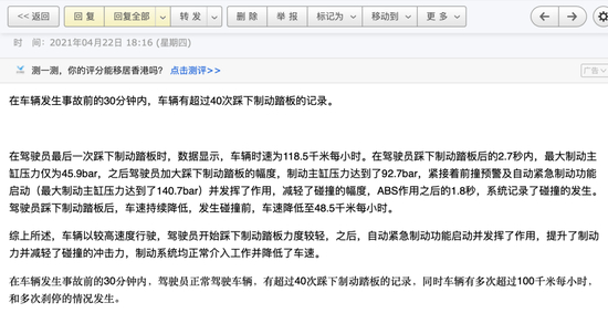 特斯拉公开内容提及,在车辆发生事故前的30分钟内,驾驶员正常驾驶车辆,有超过40次踩下制动踏板的记录。