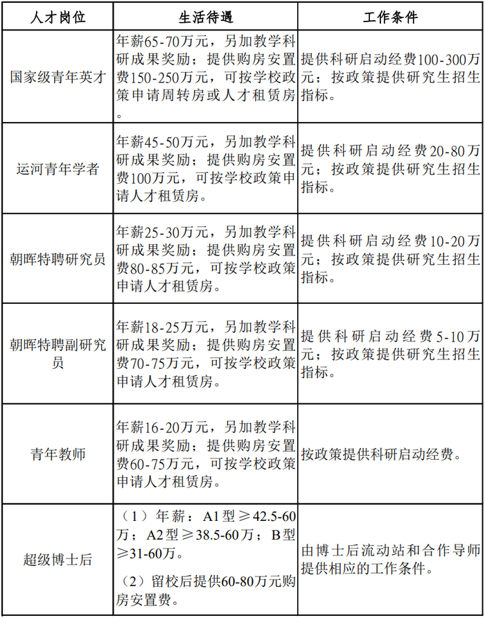 (1)“运河青年学者”岗位:面向年龄在38周岁以下,有一年以上海外科研工作经历,在本学科领域取得国内外同行公认的创新成果,具有冲击国家级人才项目潜力的优秀青年学者。