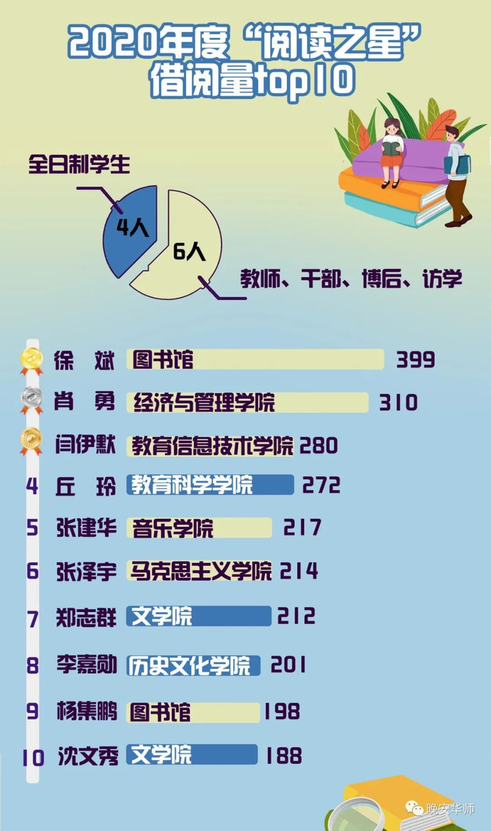 在2020年度“阅读之星”Top10评选中,有四位是我校全日制硕士研究生,六位是我校教师、干部、博后、访学学者。其中,图书馆副馆长徐斌老师一年内的借阅量高达399本,平均下来就是一天阅读一本以上的书!阅读是一件终身的事,看得出,在华师无论是学生还是老师,都将阅读变为了一种生活习惯。
