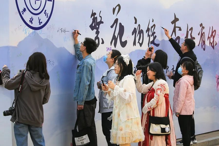 正在展位排队的2019级本科生侯佳辰是第一次参加杏花文化节,他表示,去年因为疫情同学们不能返回校园只能“云”赏花,今年的线下体验感觉很棒,活动都很有趣。