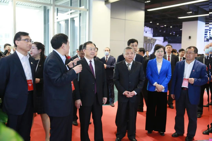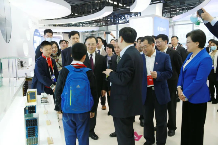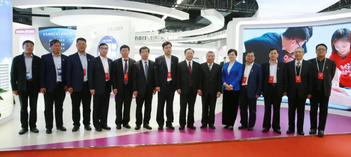 在开幕式结束后,我校全体校领导陪同江苏省省长吴政隆,工业和信息化部副部长、国家航天局局长张克俭,江苏省委常委、南京市委书记韩立明一行参观我校科普展区,副校长廖文和向巡馆领导汇报我校在航天领域取得的成绩,最后所有领导在我校展区前合影留念。
