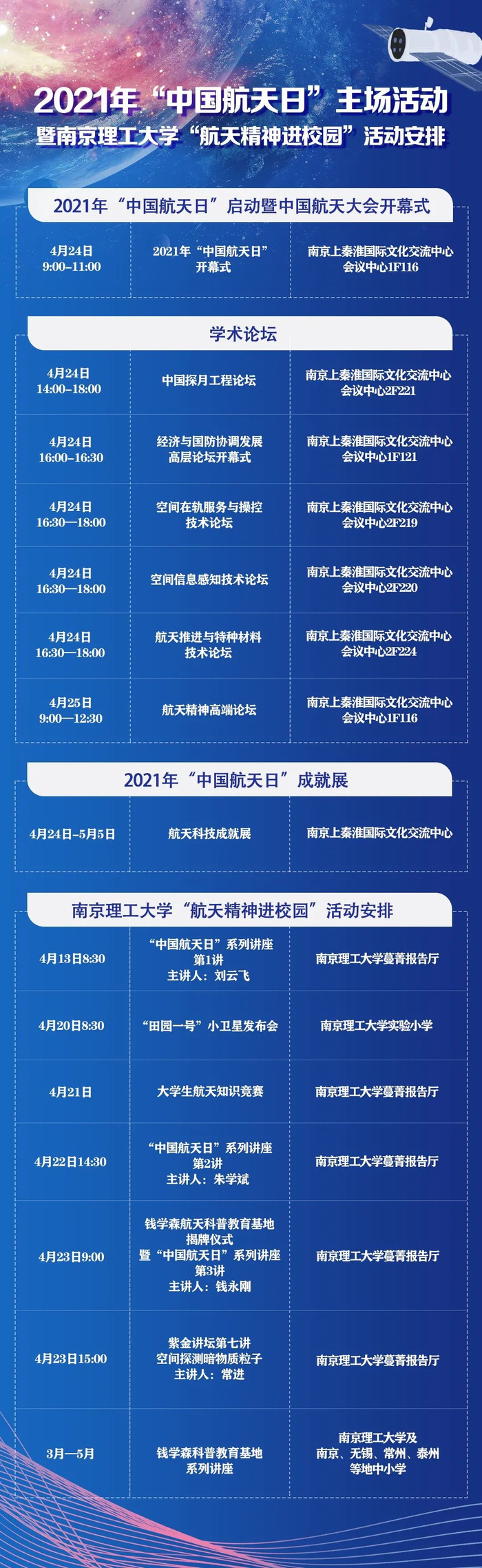 仪式结束后,主题为“扬帆起航,逐梦九天”的中国航天日科普宣传周、国际月球科研站宣介会、空间技术与发展论坛、航天专家思政公开课等40余场系列活动将在南京陆续举办。其中中国航天日科普宣传周将从4月24日持续至5月5日,活动围绕我国航天事业取得的辉煌成就,展示航天技术应用成果,展望未来美好愿景,包括航天成就科普展、建党百年航天摄影图片展、中国航天企业展、商业航天专题展,以及江苏地方产业融合专题展等内容。