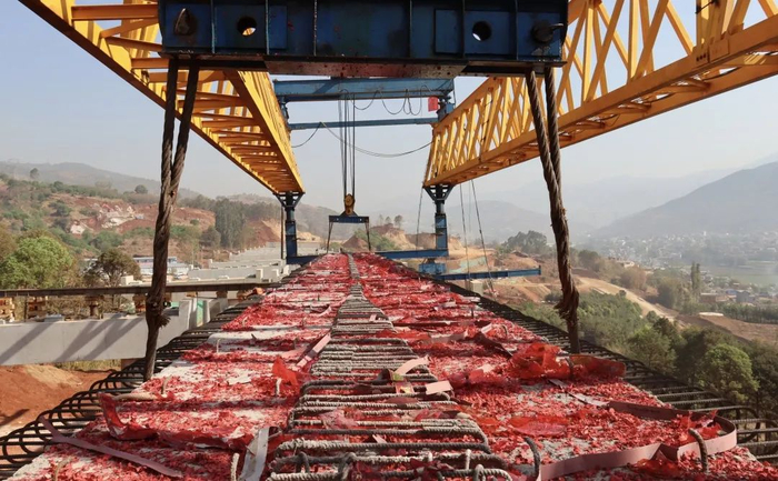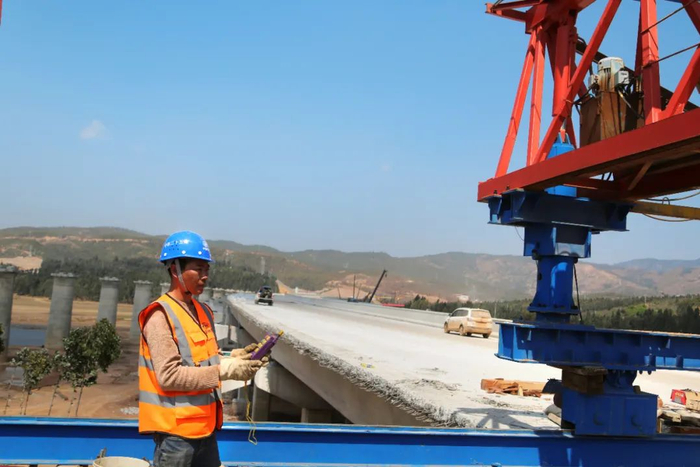 4月12日上午10时,云南省最大在建高速公路枢纽互通——宾南高速浑水海立交首片预制箱梁架设成功。