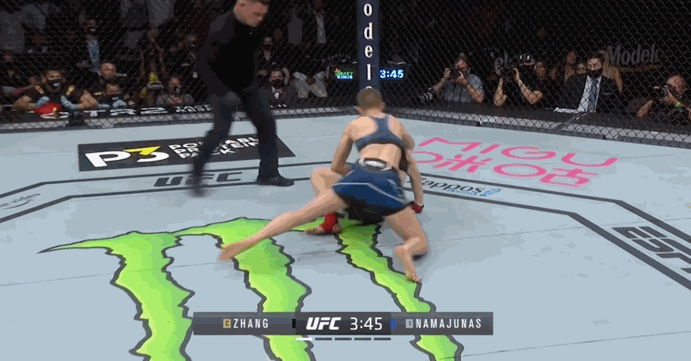 遗憾的是,仅过了一分多钟,张伟丽就被对手TKO,并遭到对手追击,裁判随即叫停比赛,时间显示为1分18秒。