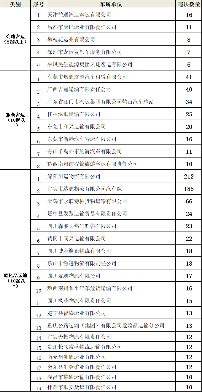 从交通违法数量来看:绵阳川运物流有限公司(212 起)、宜宾市达通物流有限公司汽车队(185 起)、宝鸡市永联特种货物运输有限公司(66起)、东莞市熠通旅游汽车租赁有限公司(41起)、广西吉通运输有限责任公司(40起)等5家外省危化、客运企业交通违法较为突出,如表所示: