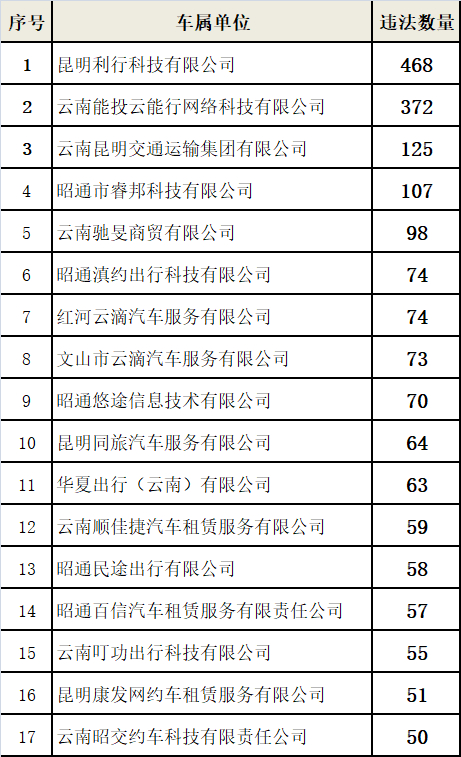 3月,全省共查处网约车交通违法4272起,同比上升15.68%。其中,交通违法数量达50起以上的网约车公司有17家,如下表所示: