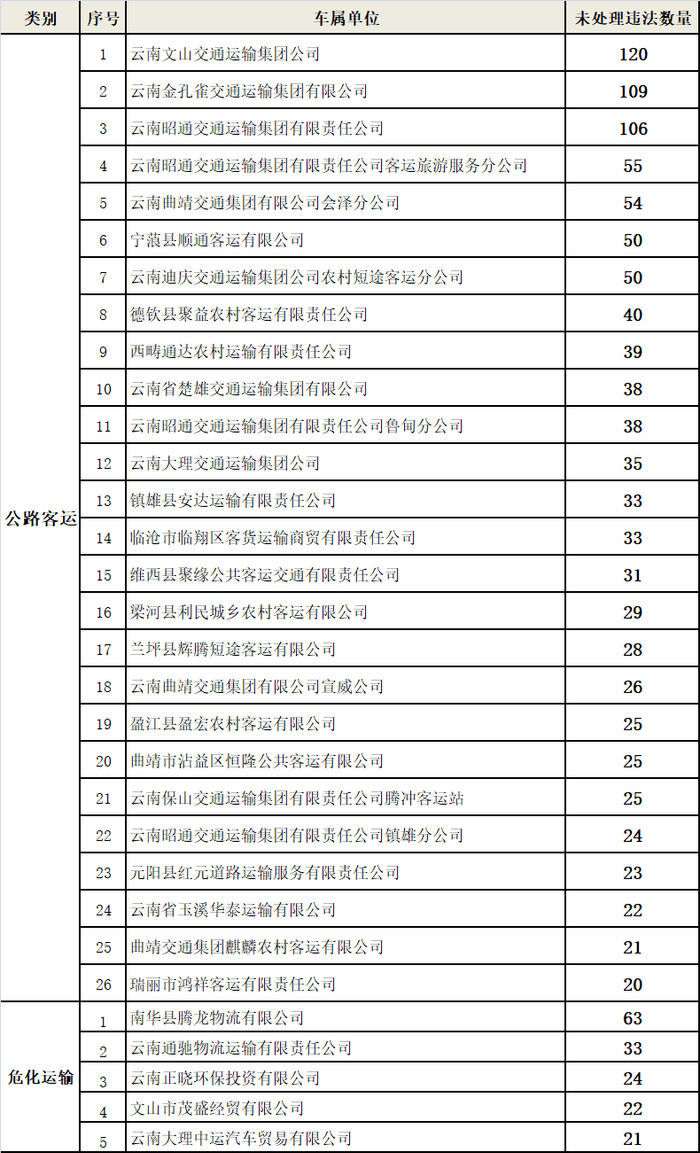 截至3月底,本省“两客一危”车辆未处理的交通违法有3013起,违法未处理达20起以上的公路客运企业有26家,违法未处理达20起以上的危化品运输企业有5家如下表所示: