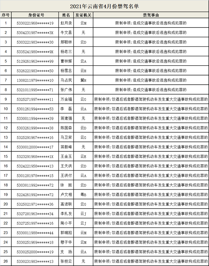 云南省公安厅交通警察总队曝光2021年4月份终生禁驾人员名单,共计26人。