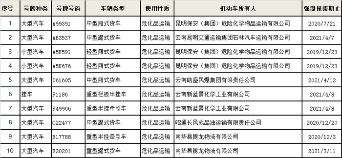 截至2021年4月22日,全省逾期未报废的危化品运输车,共有10辆: