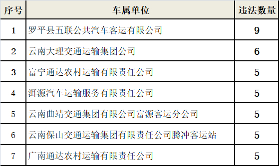 营运客车超员违法情况:3月份,全省查处本省籍客运车辆超员的交通违法165起。发生客运车辆超员违法5起以上的客运企业7家,如下表所示: