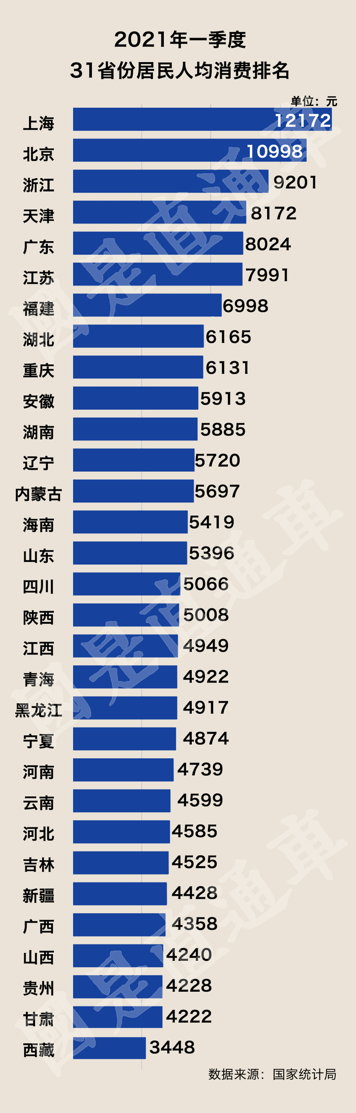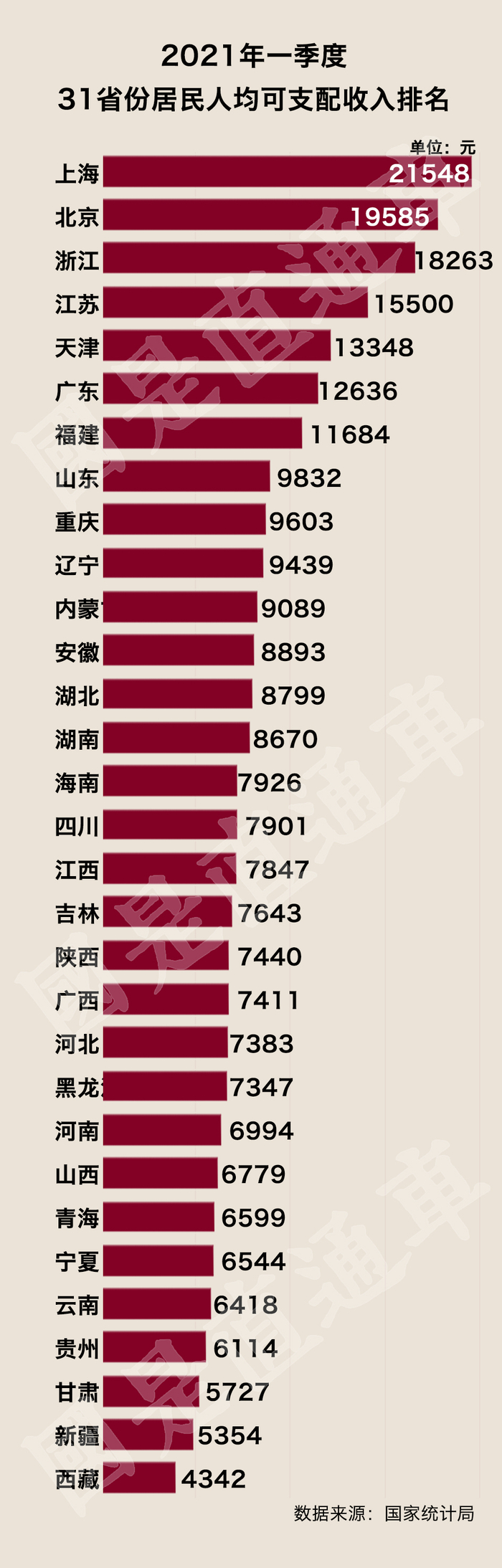 其中,排名榜首的上海达到21548元,也是全国唯一突破2万元大关的地区。紧随其后的北京为19585元,浙江为18263元。