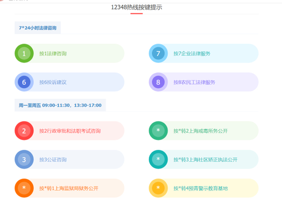 12348热线:1号键7*24法律咨询,其他键接待时间为工作日上午9:30—11:30,下午1:30—5:00