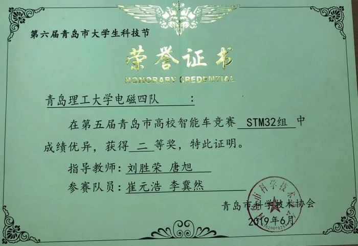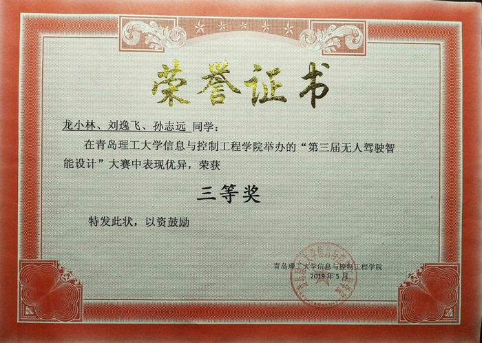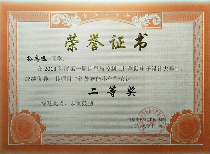 孙志远,通过大学英语四级、计算机二级。获得学院电子设计大赛二等奖、第三届无人驾驶智能设计三等奖。成功就读哈尔滨工程大学电子信息专业。