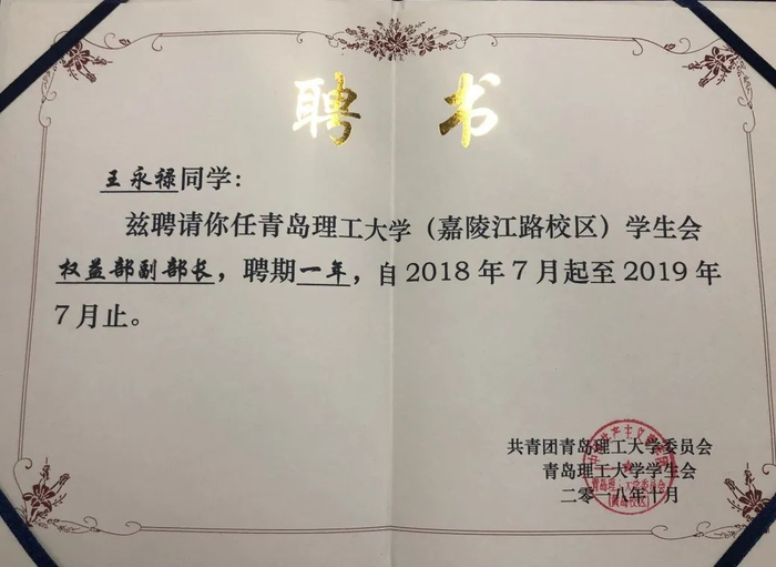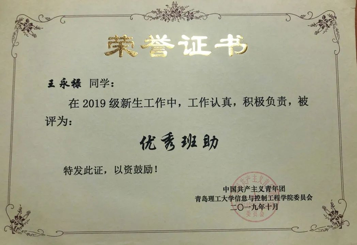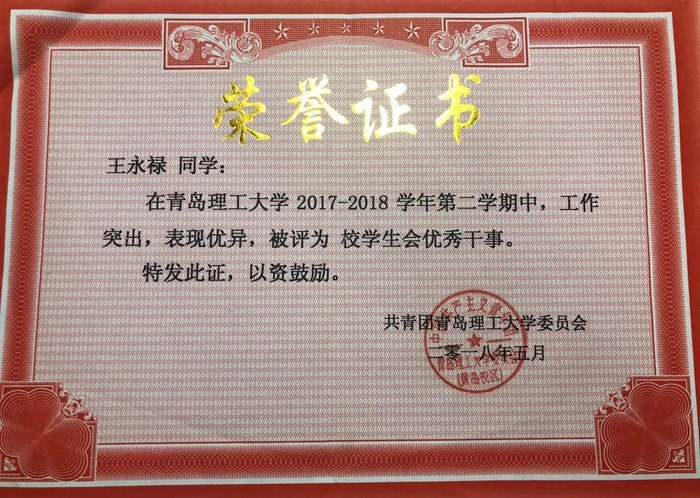 王永禄,舍长,一次性通过大学英语四六级,在校期间获得校学生会优秀干事、优秀班主任助理等荣誉称号,担任校学生会部长。以青岛校区综合成绩第一名的成绩进入哈尔滨工程大学。
